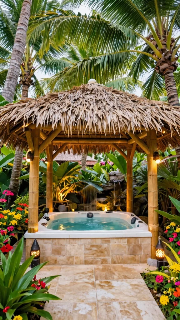 Transform your backyard into a tropical oasis with a pergola that radiates vacation vibes. Imagine lush palm trees and colorful blooms surrounding your hot tub, creating a serene getaway right at home. This design often features cozy bamboo or thatched roofs, inviting you to unwind in a vibrant, warm atmosphere.