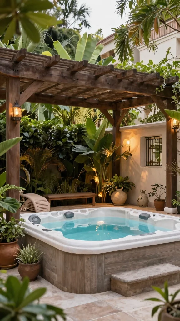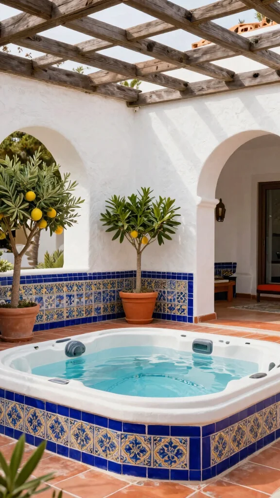 Enhance the Mediterranean vibe by adding decorative tiles around the hot tub or using mosaic patterns for benches. Lush potted plants like citrus or olive trees further enrich the aesthetic.