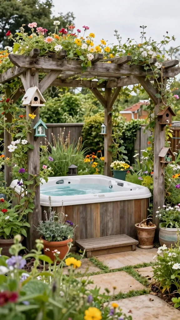 Create a charming retreat with a cozy cottage garden pergola that feels like a hidden gem. This design features rustic wooden beams entwined with climbing flowers and lush vines, establishing a vibrant environment for your hot tub. The surrounding garden can be filled with wildflowers and herbs to enhance the enchanting vibe.