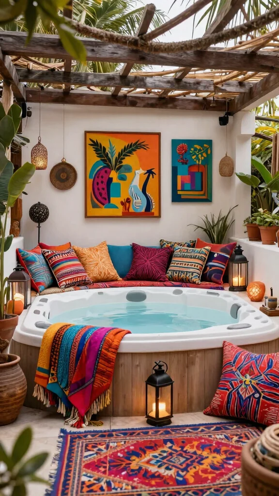 Artsy Bohemian retreats prove that hot tub pergola ideas shine with color and personality. Mix vibrant textiles, eclectic decor, and layered art for a cozy, inviting vibe—no rules, just expressive comfort you can customize today.