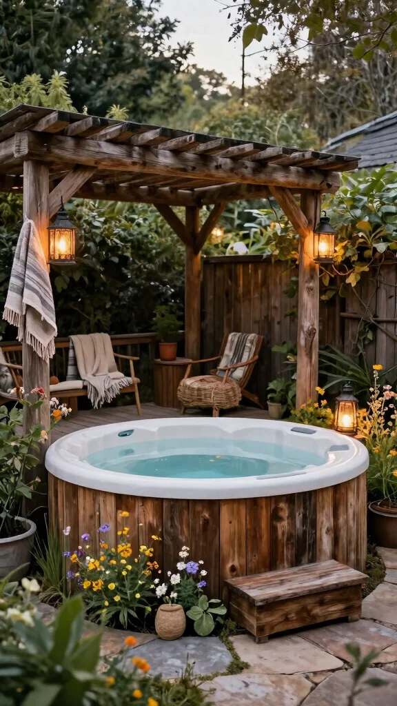 If you cherish the warmth of rustic aesthetics, a rustic hot tub could be the perfect addition to your backyard haven. Embracing reclaimed wood, distressed finishes, and vintage decor creates a cozy cabin-like vibe that transports you to the countryside. An in-ground hot tub framed with timber or placed beside a wooden pergola fosters that inviting charm. Surrounding it with native wildflowers enhances the authentic rustic feel, while adding warm throws and lanterns creates a cozy atmosphere for evening relaxation.