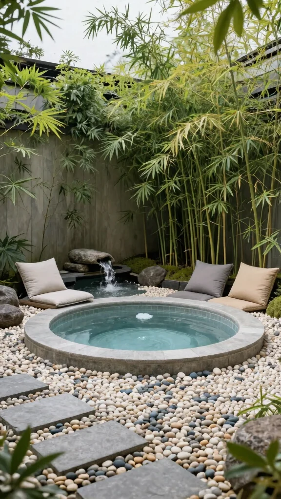 For those in search of tranquility, a Zen garden-inspired hot tub creates a peaceful retreat that embodies calmness. By incorporating elements like bamboo, smooth rocks, and minimalistic plants, you can forge a serene setting that encourages relaxation. Opt for an in-ground hot tub surrounded by pebbles and small bonsai trees, while the soothing sound of water from a nearby fountain enhances the mindfulness of your space. Designing the layout to promote meditation and contemplation, with shaded seating areas and comfortable cushions, elevates your retreat to new heights.