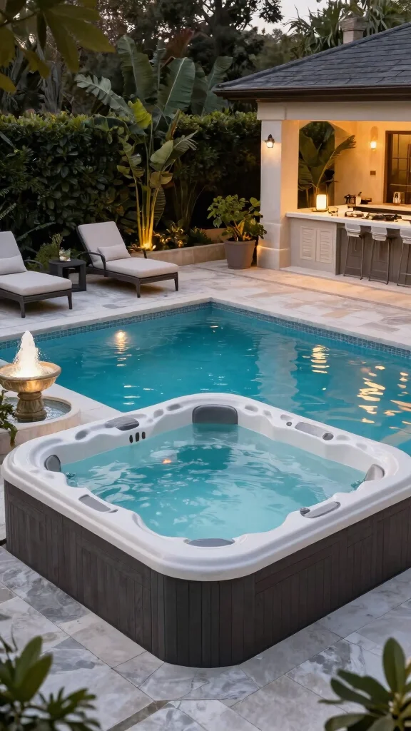 To achieve this elegant poolside atmosphere, opt for high-end finishes like glass tiles or natural stone, adding a touch of luxury. Creating intimate seating areas with stylish outdoor furniture fosters comfort and invites social gatherings. Additionally, incorporating lighting that enhances both the hot tub and pool at night adds a magical ambiance.
