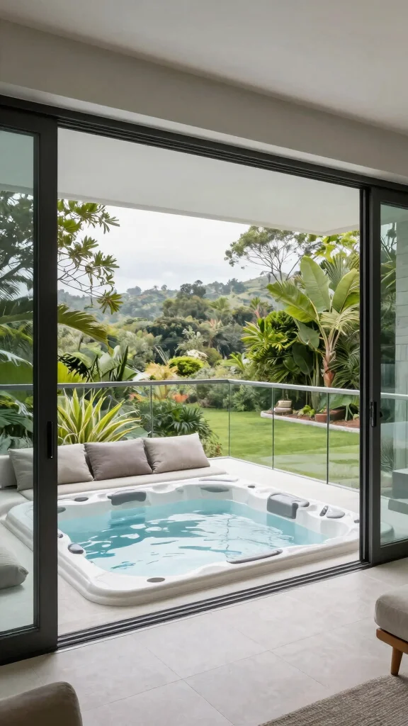 If you desire the best of both worlds, consider an indoor-outdoor fusion hot tub design! This style allows you to enjoy the comfort of indoor amenities while embracing the beauty of your outdoor spaces. A large sliding glass door that opens to an in-ground hot tub on your patio creates stunning views and seamless transitions between areas. Enhancing this concept with comfortable seating and glass railings ensures uninterrupted views, making your space versatile for relaxation and entertainment.
