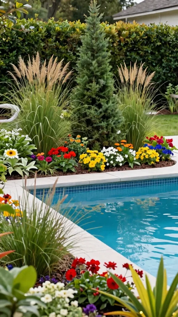 Arrange plantings to frame the pool, creating stunning views from every angle. Consider incorporating evergreens or decorative grasses for winter interest, ensuring your pool area remains appealing even in colder months.