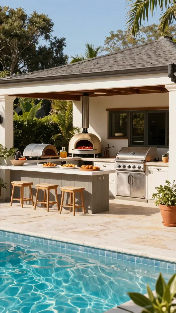 Imagine the convenience of having an outdoor kitchen right next to your inground pool, perfect for entertaining while enjoying the sun. Picture a modern grill, a pizza oven, and generous counter space, all just steps away from the water. This setup is ideal for hosting friends and family during sunny days.