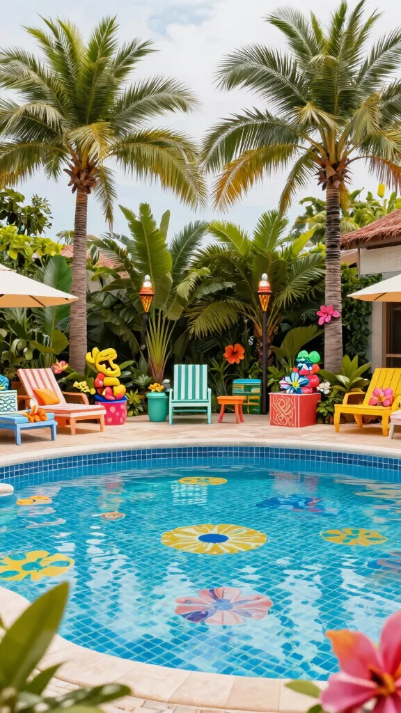 Consider adding tiki torches for a true tropical feel or nautical flags for a beachy vibe. Incorporate color schemes and patterns that resonate with your theme, ensuring everything from the tiles to the landscaping aligns perfectly.