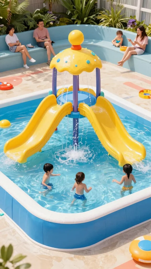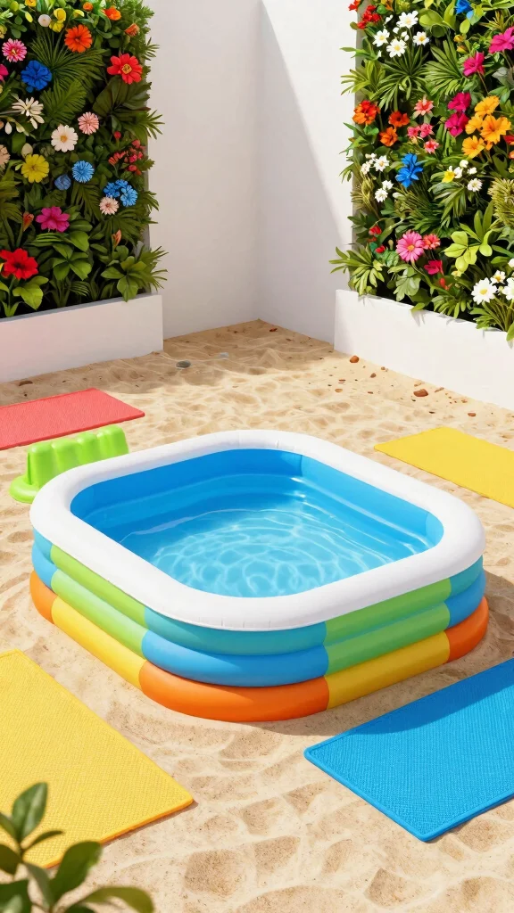 Surround the pool with sand or rubber mats to ensure a safe play area. Enhance the aesthetics by incorporating vertical gardens around the pool. This versatility allows you to change the setup as your family’s needs evolve.
