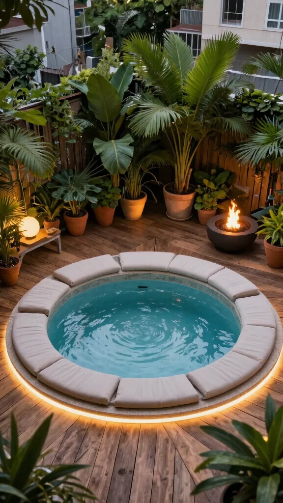 Surround the pool with potted plants and soft cushions to create a cozy atmosphere. Consider adding LED lighting and a fire pit for warmth during evening relaxation. This setup not only provides a tranquil escape but also adds elegance to your garden.