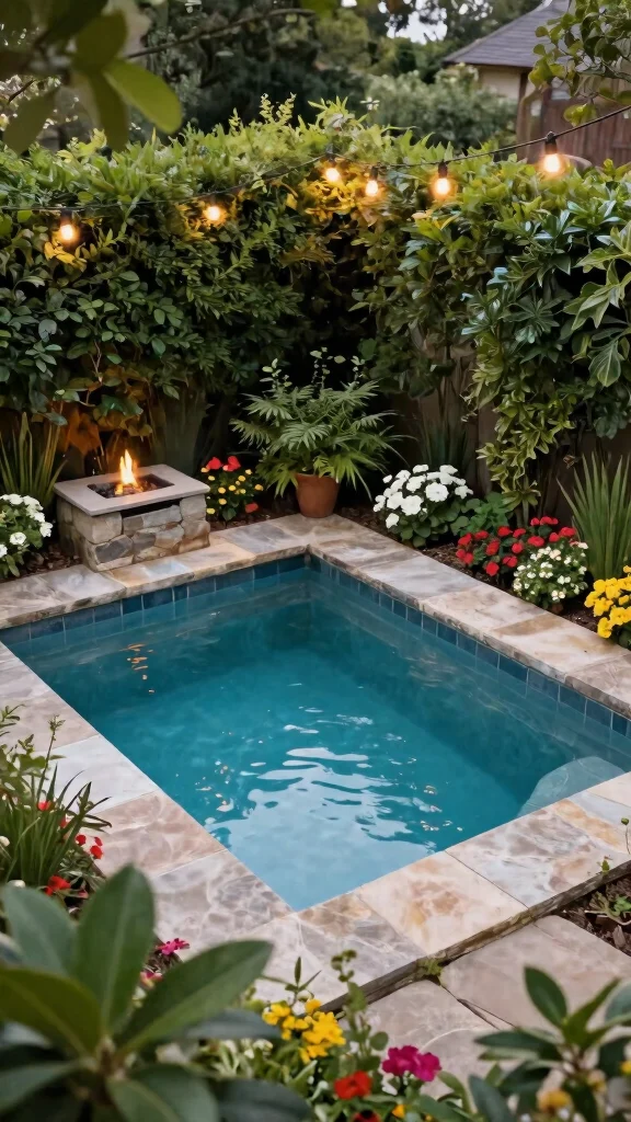 Use natural stones for tiling, ensuring a seamless blend with your garden. Consider adding a fire pit for chilly evenings or string lights overhead for a warm ambiance. This cozy corner pool provides a personal sanctuary where you can unwind.