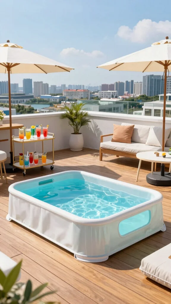 Fun fact: A lightweight, portable mini pool on a rooftop can be installed in as little as 2 hours and removed in just 15 minutes. Pair it with a deck, comfy seating, and shade for stress-free summer lounging.