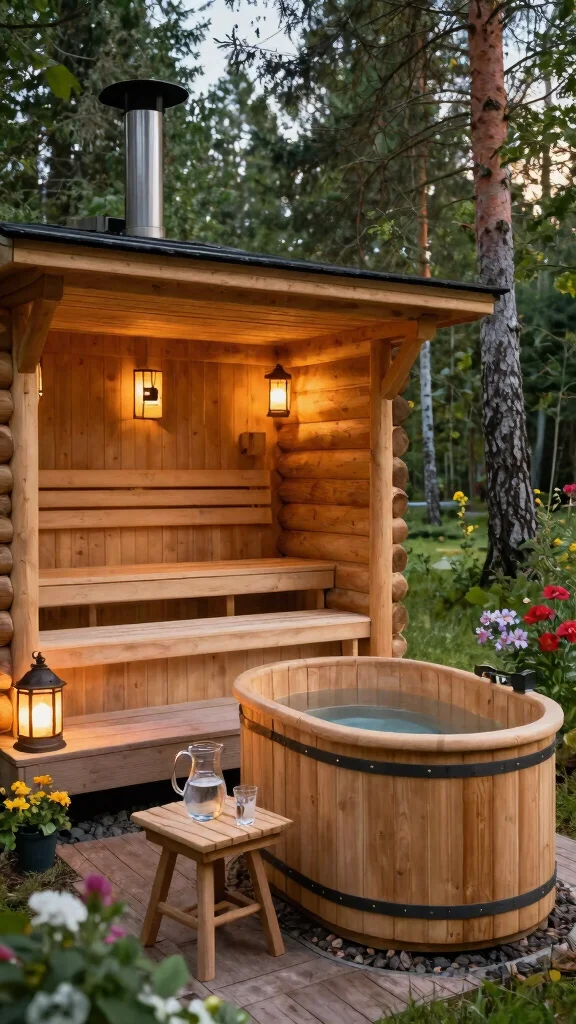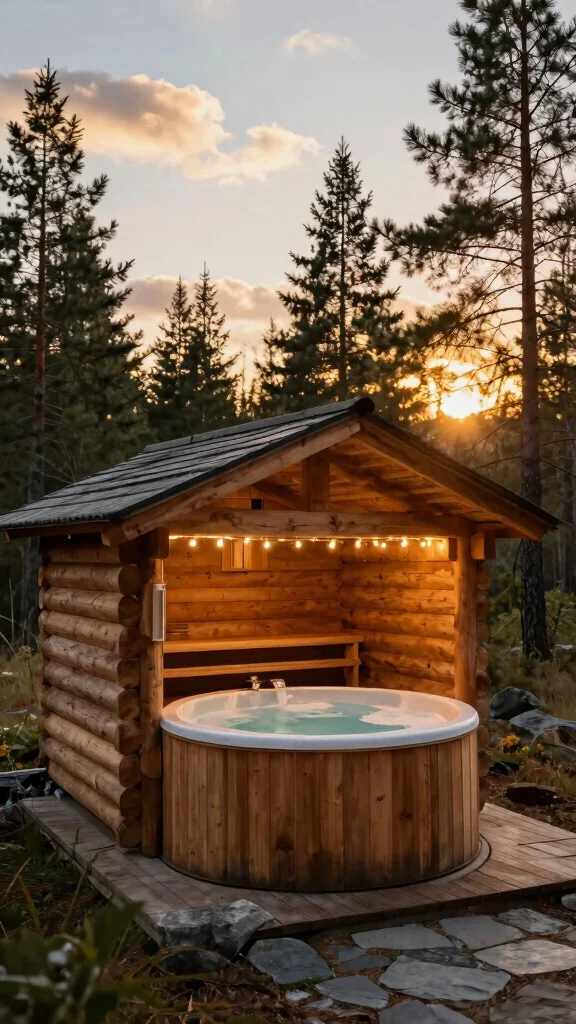 Imagine retreating into nature with a rustic wooden sauna paired perfectly with a round hot tub. This charming duo not only enhances your outdoor aesthetic but also caters to your wellness needs. The natural wood tones of the sauna beautifully contrast with the inviting, bubbling water of the hot tub, creating a cozy escape for relaxation.