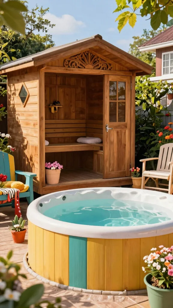 Add a playful touch to your outdoor space with a vintage sauna paired with a retro hot tub. This nostalgic combination brings back the charm of classic spa days while offering modern comfort. The vintage sauna, featuring beautiful woodwork and antique details, pairs perfectly with a vibrant retro hot tub that showcases fun designs.