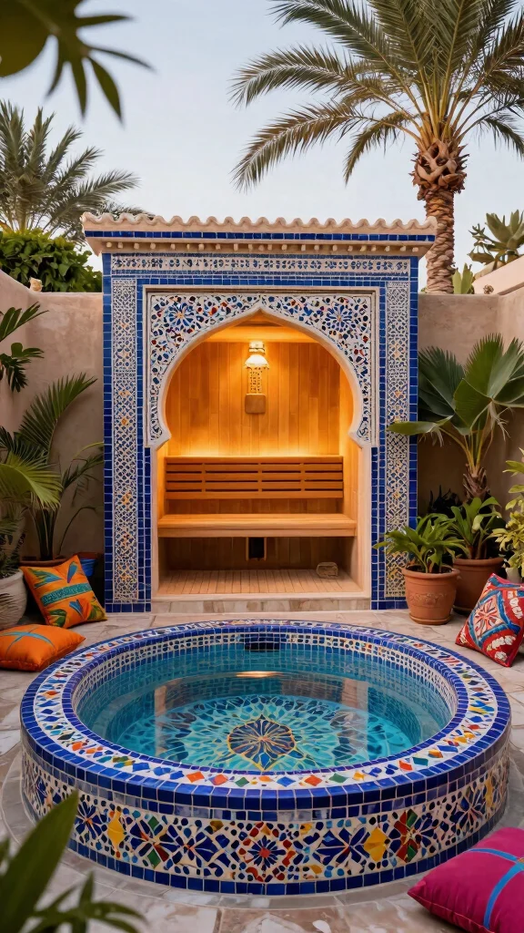 13. Moroccan-Inspired Sauna & Mosaic Hot Tub