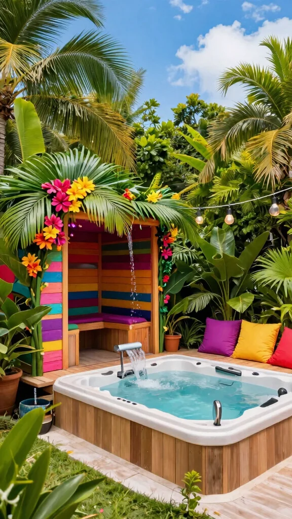 Create your own paradise with a tropical-themed sauna and a lush hot tub. This vibrant combination invites colorful décor and exotic plants, offering a laid-back atmosphere that transports you to an island getaway. The sauna, decorated with tropical motifs and surrounded by palm trees, provides a warm escape, while the hot tub often features a waterfall and colorful flora.