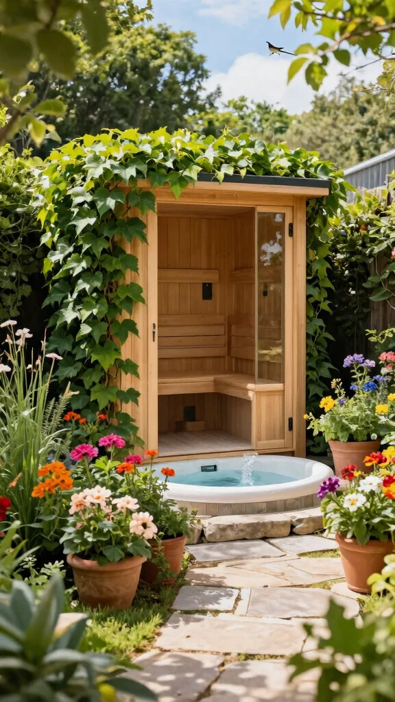 Blend nature into your outdoor space with a garden-style sauna and a hot tub surrounded by vibrant planters. This combination enhances your garden’s beauty while providing a serene area for relaxation. The sauna, adorned with climbing plants and flowers, seamlessly merges with the surrounding flora, creating a peaceful oasis.