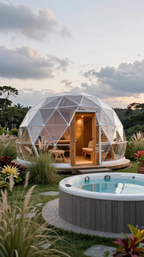 Experience something truly unique with a geodesic dome sauna paired with a circular hot tub. This eye-catching combination not only looks intriguing but also offers fantastic heat retention and aesthetic appeal. The dome sauna creates a spacious environment for comfort, beautifully complementing a circular hot tub that encourages social gatherings.