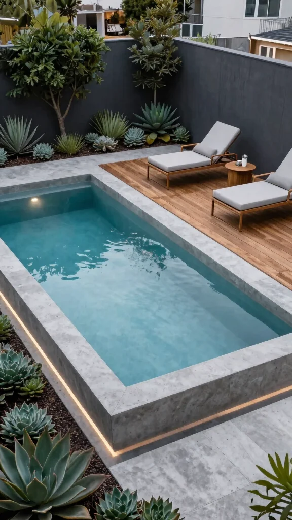 Start by choosing a linear pool shape that complements narrow areas. Enhance the space with low-maintenance plants like succulents, and consider a wooden deck for added warmth. With this design, you can enjoy a peaceful oasis right in the heart of the bustling city.