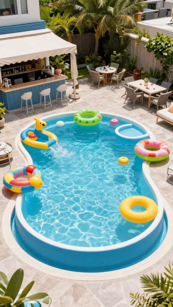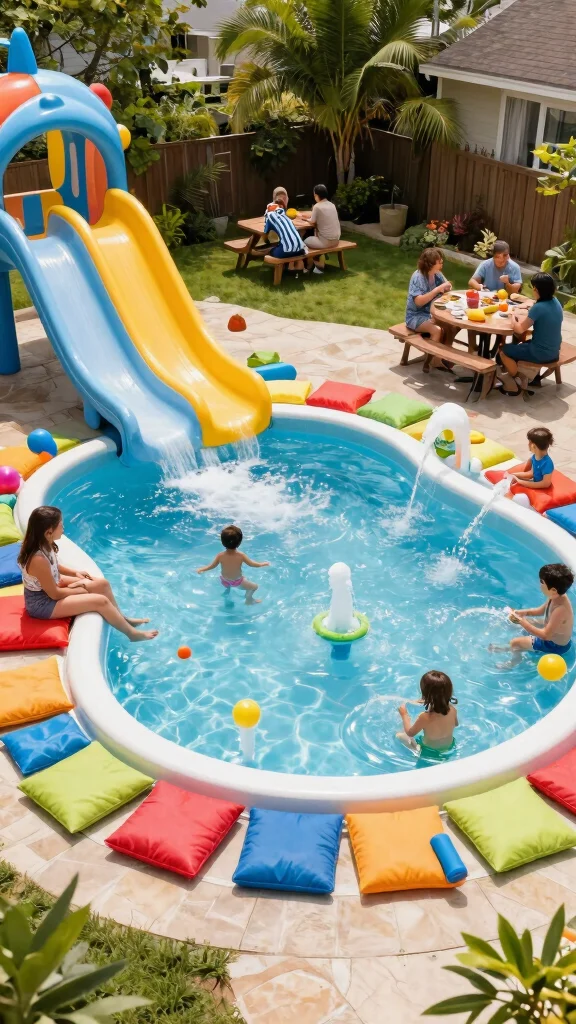 Use water-friendly materials for surrounding furniture to enhance durability. Incorporate pool games for interactive fun, and set up shade options to keep kids cool on hot days.