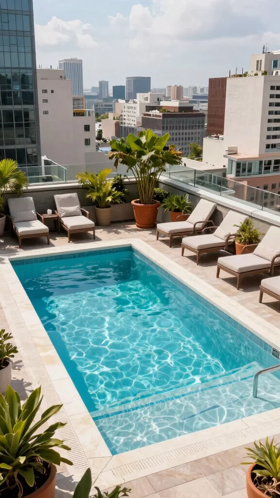 A rooftop plunge pool provides a unique social space, perfect for enjoying sunset views and entertaining friends in an urban setting.