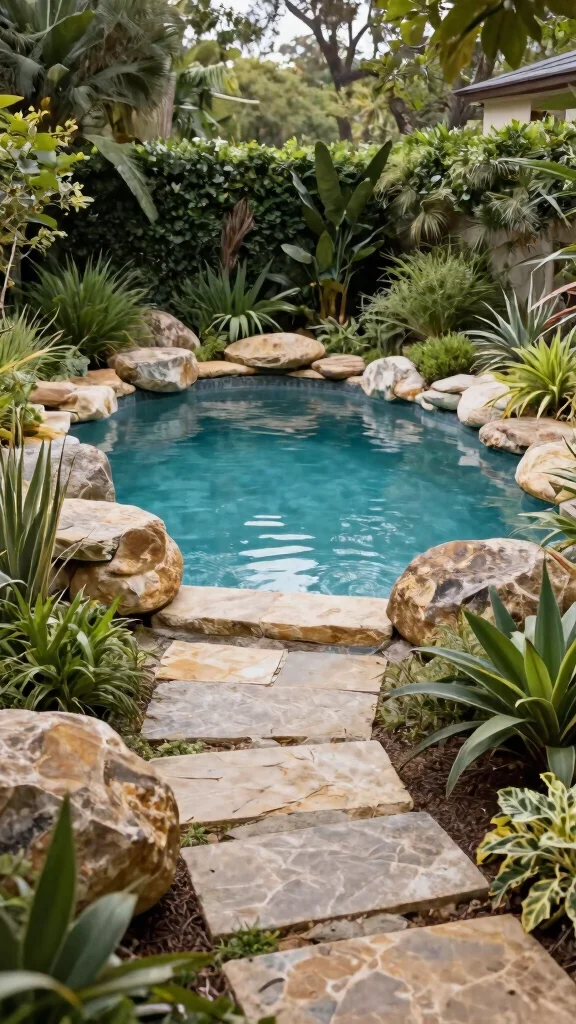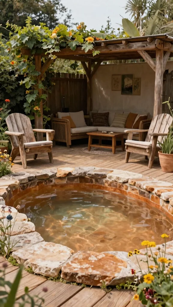 Consider incorporating a wooden pergola adorned with climbing plants for added shade and style. Using natural stones for the pool edges will further enhance the organic look. Lanterns or candles can provide a warm glow for evening relaxation.