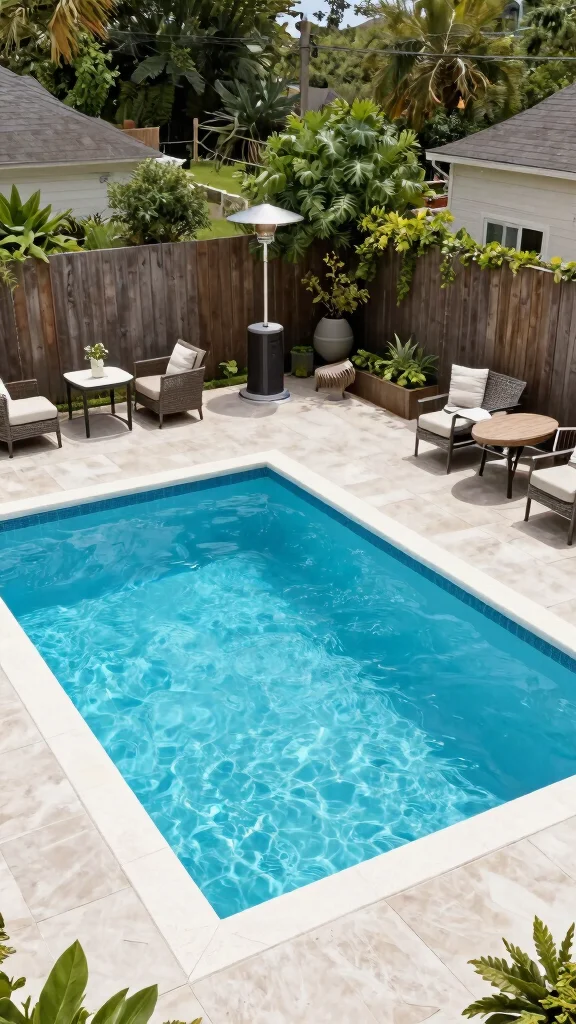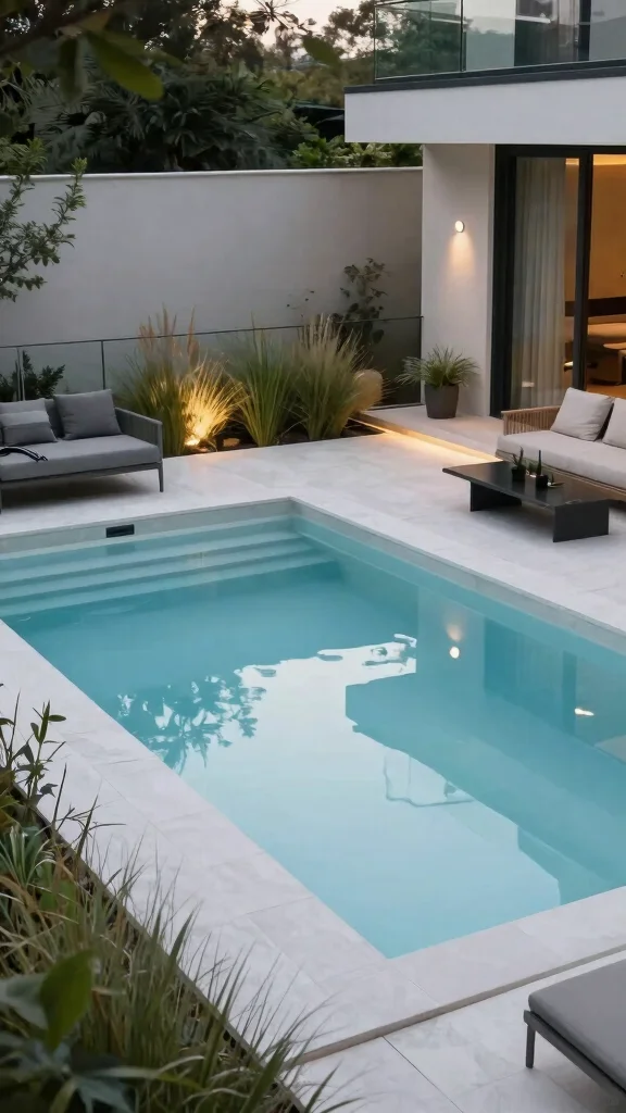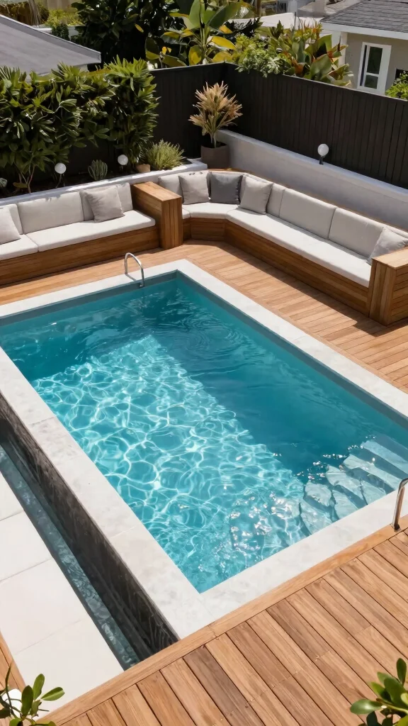 Use affordable but attractive finishes, like ceramic tile banding or pebbled aggregate, and pair the pool with a slim deck or stone border that echoes your garden small space gardening style.