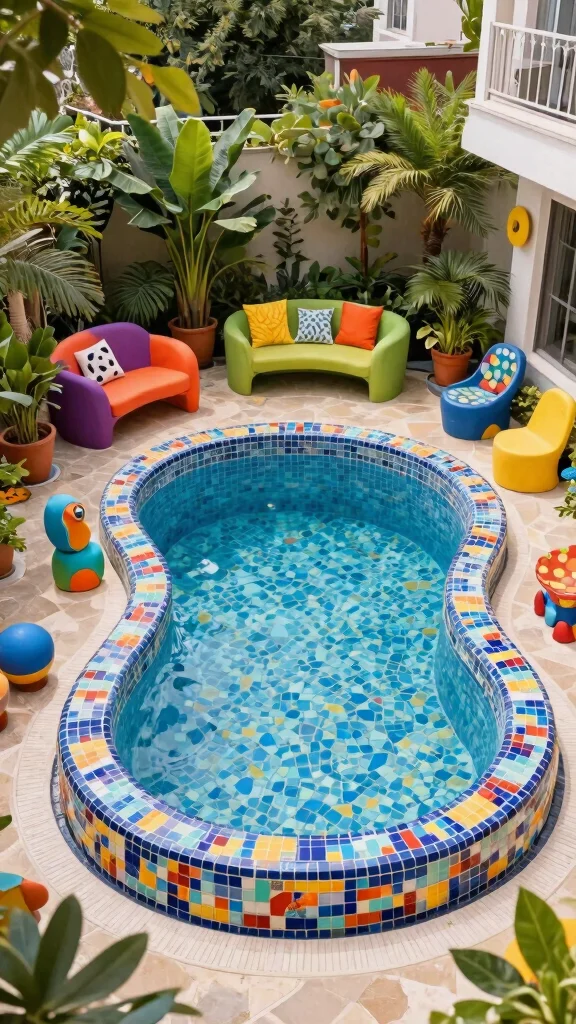 Consider incorporating a mosaic tile design on the pool floor for added visual interest. Choose furniture with bold patterns or colors that complement your pool’s design. Using lighting to highlight artistic features can create a striking display in the evenings.
