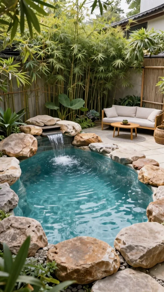 Adding a small rock garden nearby can enhance the serene atmosphere. Use ambient lighting to create a gentle glow in the evenings, and consider a small waterfall for soothing sounds as you unwind.