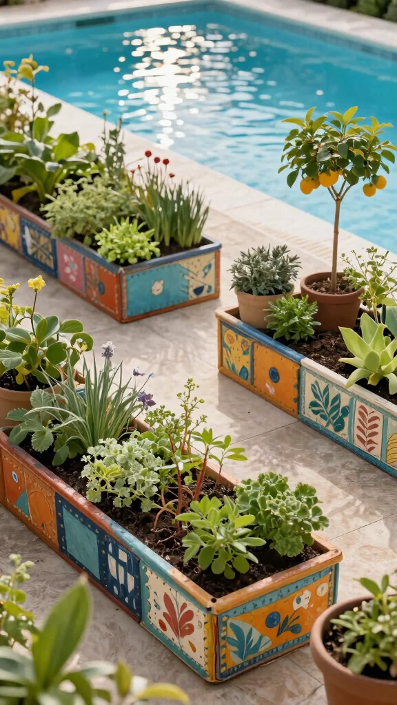 Consider using raised beds made from recycled materials to house your plants along with decorative elements that enhance the visual appeal. This will turn your poolside into a productive and attractive area.