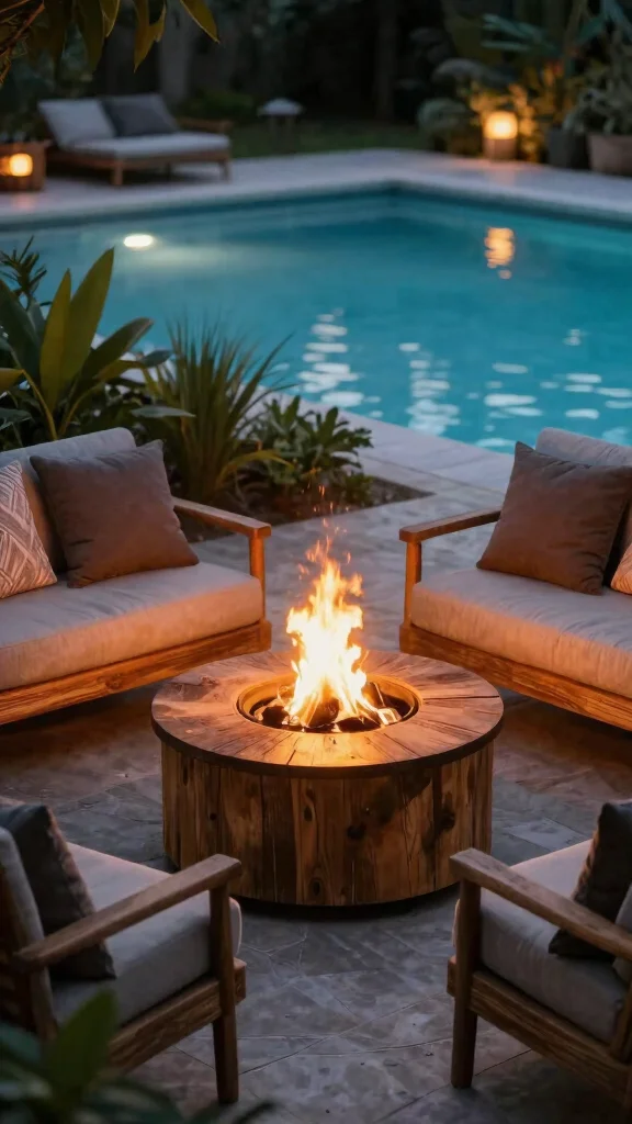 Adding a fire pit to your pool deck creates a warm gathering space that enhances your outdoor design. Opt for eco-friendly options made from sustainable materials, such as recycled stone or metal. This allows you to enjoy cozy evenings by the fire while being mindful of the environment.