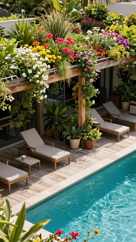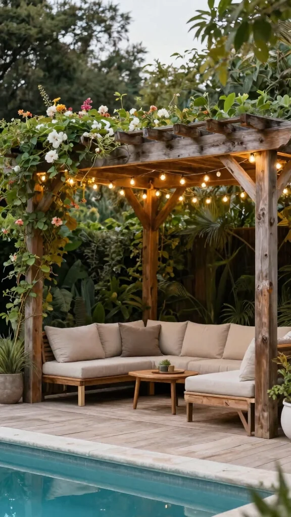 A pergola can beautifully enhance your pool deck while offering essential shade. Using sustainable materials like reclaimed wood or bamboo adds an eco-friendly touch. Train climbing vines or flowering plants to grow over the pergola, creating a cool, inviting area for relaxation.